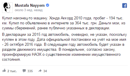 Народный депутат Верховной Рады Украины от "Блока Петра Порошенко" Мустафа Найем прокомментировал сообщение НАПК о привлечении его к ответственности за неверные данные в электронной декларации.