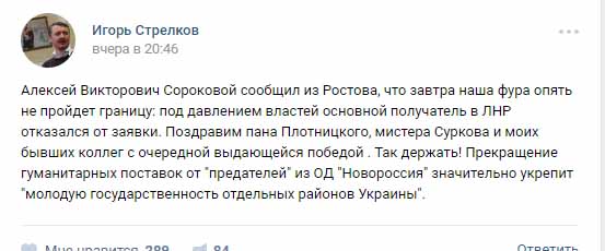 “Поздравим пана Плотницкого, мистера Суркова и моих бывших коллег с очередной выдающейся победой . Так держать!" - заявил Стрелков.