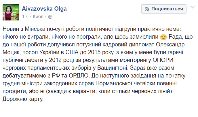Айвазовская отметила, что на данный момент в Минске сохранился статус-кво: Украина ничего не выиграла, но ничего и не проиграла. При этом она интригующие отметила, что украинские дипломаты "кое-что задумали", сопроводив запись веселым смайлом.