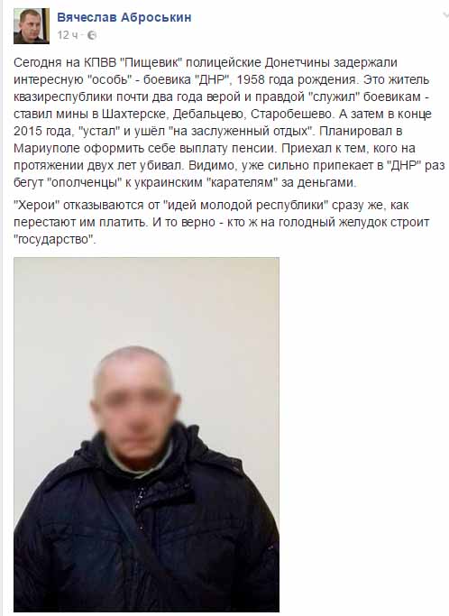 “Это житель квазиреспублики почти два года … ставил мины в Шахтерске, Дебальцево, Старобешево. А затем в конце 2015 года "устал" и ушел "на заслуженный отдых"”, - пишет в Facebook Аброськин.