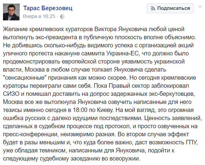 Проведением провальной пресс-конференции Виктора Януковича кремлевские технологи смогли переиграть только сами себя и допустили большую ошибку. Пока украинские активисты из Правого сектора блокировали изолятор и доставку бывших силовиков в суд, Кремль силой выпихнул Януковича на пресс-конференции и заставил озвучить написанные ранее тезисы специально для СМИ.