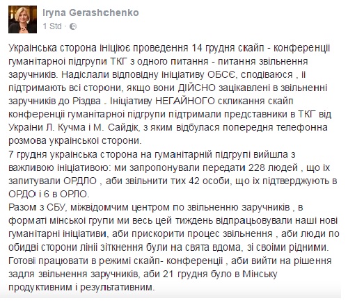 Вдобавок Ирина Геращенко отметила, что ранее, 7 декабря, Украина выразила инициативу передать 228 задержанных сепаратистов, которых запрашивает ОРДЛО, чтобы освободить 48 украинских заложников (42 - в ОРДО и 6 - ОРЛО).