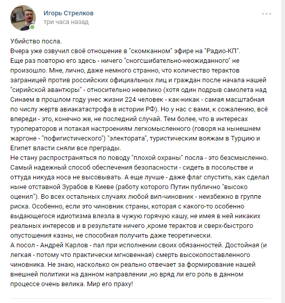 Один из отцов-основателей “ДНР” Игорь Стрелков не удивлен убийством посла РФ в Турции Андрея Карлова и ожидает новых “официальных” жертв от рук мстителей за нарушение мирового порядка.