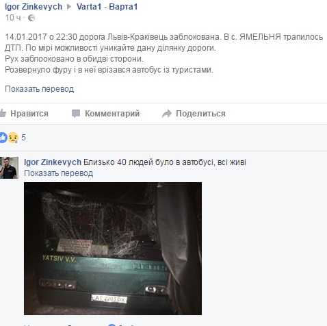 Как написал депутат Львовского горсовета Игорь Зенкевич в своем Facebook, ДТП произошло в районе села Ямельня в 22:30 вчера 14 января, передает "Диалог. UA".
