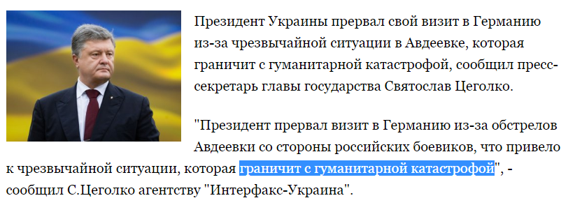 Пресс-секретарь президента Украины Святослав Цеголко, сообщая о прерывании гарантом поездки в Берлин, назвал ситуацию, которая сложилась в Авдеевке таковой, что "граничит с гуманитарной катастрофой".