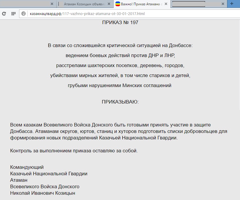 "Приказываю всем казакам Всевеликого Войска Донского быть готовыми принять участие в защите Донбасса. Атаманам округов, юртов, станиц и хуторов подготовить списки добровольцев для формирования новых подразделений Казачьей национальной гвардии", — подчеркивается в приказе Козицына.