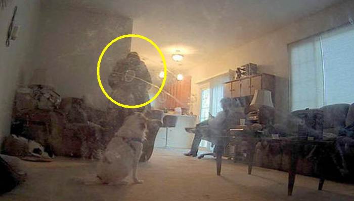 На опубликованном в Сети фото, сделанным с видеозаписи, отчетливо виден сам Тим, который сидит в кресле, а в полутора метрах от него, по другую сторону стены парит в воздухе темный силуэт крупной дамы в старинном платье. Собака в этом кадре испуганно смотрит прямо на призрак, прижав в страхе уши к голове.