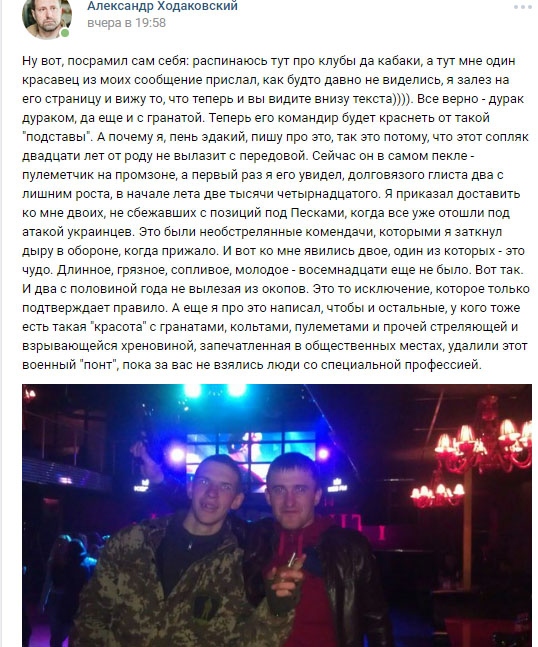 На своей странице в “ВК” Ходаковский обнародовал фото 20-летнего наемника в ночном клубе с гранатой в руках.