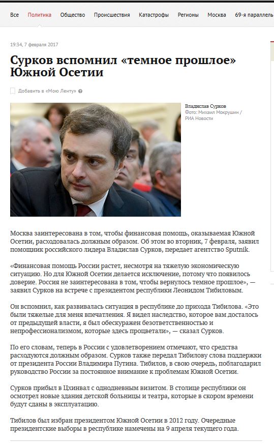 Сегодня, 7 февраля, помощник президента РФ Владислав Сурков, сделал заявление, что официальная Москва продолжает финансировать захваченную у Грузии территорию - Южную Осетию, поэтому очень важно, чтобы эти средства, тратились именно на непризнанную "республику". Кажется, что в Кремля боятся: с введением безвиза с ЕС для жителей оккупированной территории - граждане непризнанной страны перестанут подчиняться России.