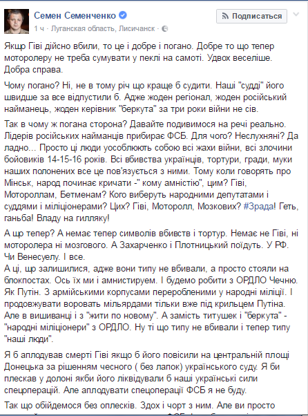 "Я бы аплодировал смерти Гиви, если бы его повесили на центральной площади Донецка по решению честного украинского суда", - написал Семенченко и добавил, что хлопал бы в ладоши, если бы Гиви действительно ликвидировали украинские спецслужбы, а не ФСБ.