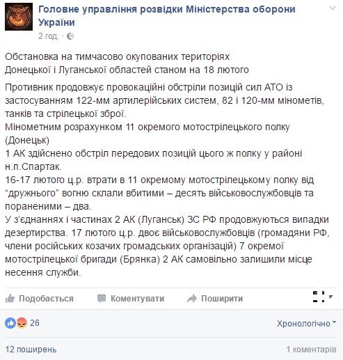 Стало известно, что указанное происшествие произошло в середине недели в районе населенного пункта Спартак. Под "дружеский огонь" отдельного мотострелкового полка из Донецка попала большая группа военнослужащих. На данный момент потери составляют 10 трупов пророссийских боевиков, а также двое "трехсотых".