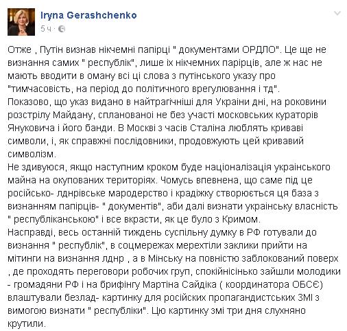 "Признание Путиным ничтожных бумажек "документами ОРДЛО" в годовщину расстрела Майдана – попытка Кремля национализировать украинское имущество на оккупированных территориях",- Геращенко