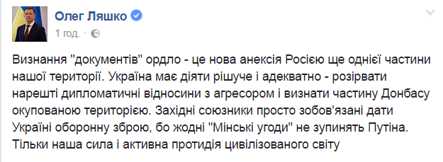"Признание "документов" ОРДЛО - это новая аннексия Россией еще одной части нашей территории. Украина должна действовать решительно и адекватно - разорвать наконец дипломатические отношения с агрессором и признать часть Донбасса оккупированной территорией. Западные союзники просто обязаны дать Украине оборонительное оружие, потому что никакие "Минские соглашения" не остановят Путина. Только наша сила и активное противодействие цивилизованного мира", - написал Ляшко в соцсети сегодня, 19 февраля.
