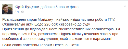 На своей странице в соцсети Юрий Луценко опубликовал данные о том, как продвигается расследование Генпрокуратурой дел, которые связаны с трагическими событиями на Майдане. В частности, он отметил, что в суде имеются обвинительные документы относительно 220 лиц, передает "Диалог.UA".