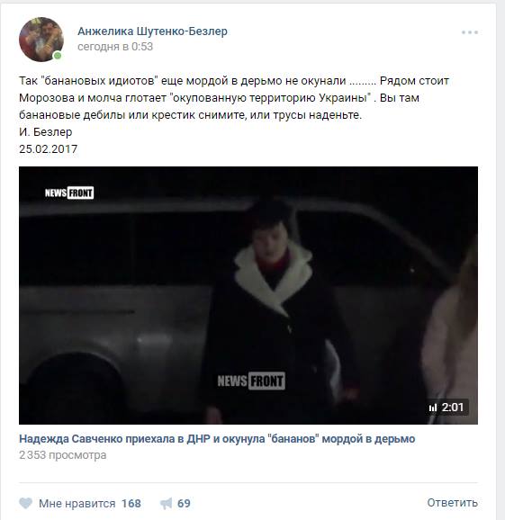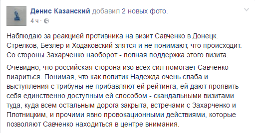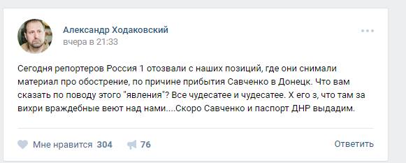 Комментируя приезд Савченко на Донбасс, журналист приводит скрины со страниц "первых лиц" политической элиты "ЛДНР", отмечая, что Стрелков, Безлер и Ходаковский недоумевают по поводу того, что вообще происходит и эта ситуация их конкретно выводит из себя.