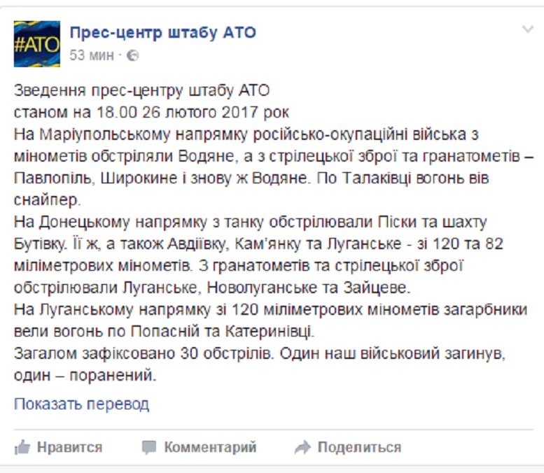 С начала суток 25 февраля силы антитеррористической операции понесли потери на фронте. В Донбассе в результате вооруженной атаки оккупантов один защитник Украины погиб, еще один боец был ранен.