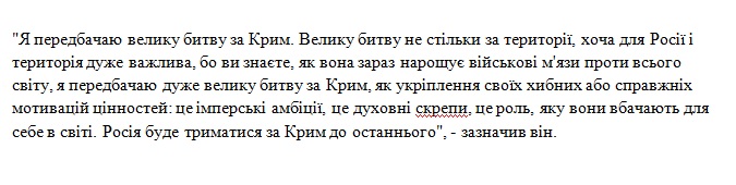Россия, продолжил нардеп, будет рассматривать борьбу за Крым как укрепление своих культурных универсалий, таких как "духовные скрепы" и имперские амбиции, которые Москва хочет распространить на весь мир.