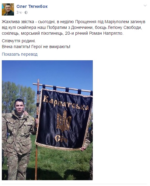 Под Мариуполем погиб от пули снайпера 20-летний Роман Напрягло, боец Легиона Свободы – Олег Тягнибок