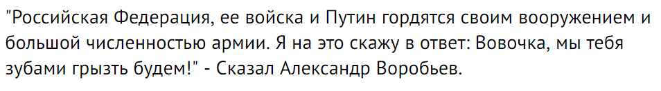 Резонансное заявление мэр города сделал во время своего выступления и заявил, что Украина будет буквально "грызть зубами Путина и его многочисленную армию". Видео эмоционального выступления политика было опубликовано в Интернете и вызвало поддержку украинцев, которые отметили эмоциональность и провокационный тон Воробьева.
