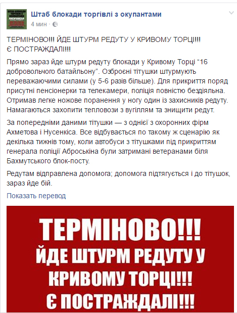 Сейчас в Кривом Торце вооруженные титушки штурмуют редут "16-го добровольческого батальона". Силы нападающих в шесть раз превышают количество ветеранов АТО.