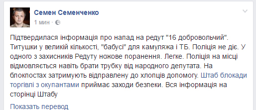 “Полиция на месте отказывается даже брать трубку от народного депутата. На блокпостах задерживают отправленную к ребятам помощь. Штаб блокады торговли с оккупантами принимает меры безопасности”, – прокомментировал ситуацию парламентарий.