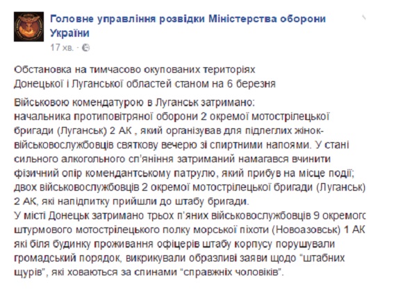 "В состоянии сильного алкогольного опьянения задержанный пытался совершить физическое сопротивление комендантскому патрулю, который прибыл на место происшествия", - говорится в сообщении ГУР Минобороны Украины.