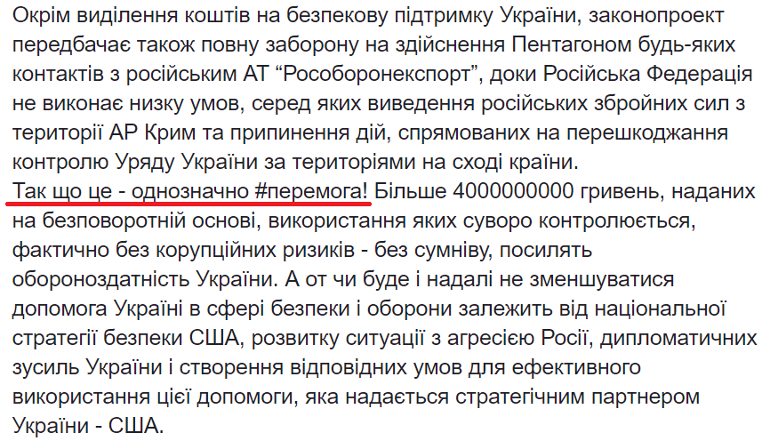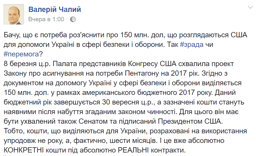 Выделение Украине 150 миллионов долларов в рамках бюджета США на 2017 год является важнейшей победой Украины, так как серьезно укрепит украинскую армию.