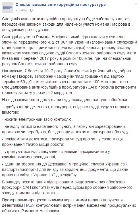 Теперь Насиров может надеть электронный браслет и отправиться домой. В его обязательства будет входить посещение детективов НАБУ и следователей САП по первому требованию.