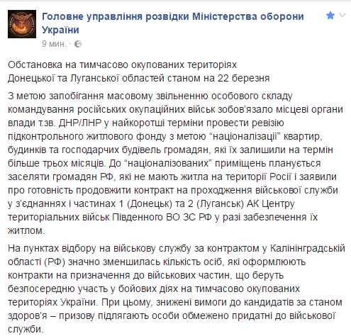 Как сообщается в Facebook на официальной странице Главного управления разведки Минобороны, на неподконтрольных Киеву территориях местные "власти" национализируют жилье, в котором не проживают более трех месяцев. Об этом передает "Диалог.UA".