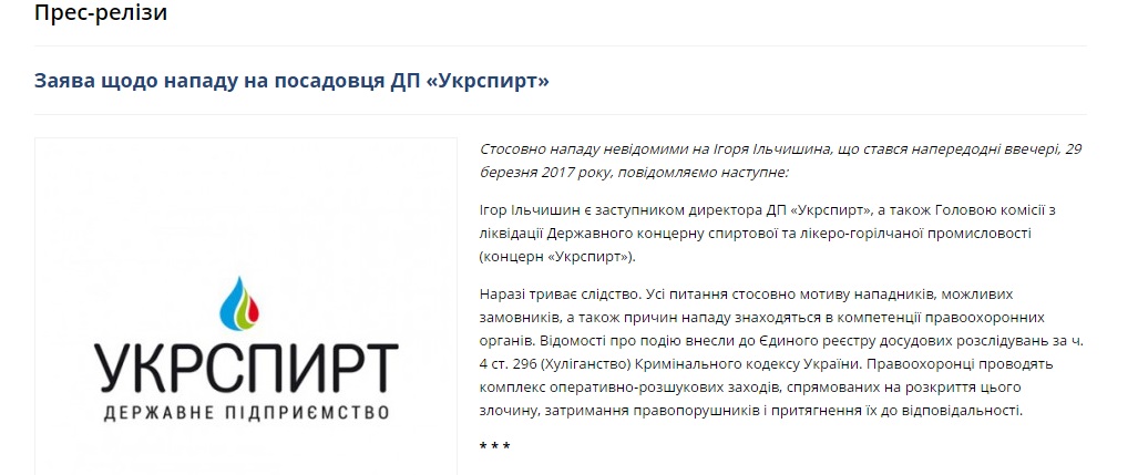 Как выяснилось сегодня 30 марта, нападение было совершено на одного из руководителей ГП "Укрспирт", замдиректора предприятия Игоря Ильчишина.