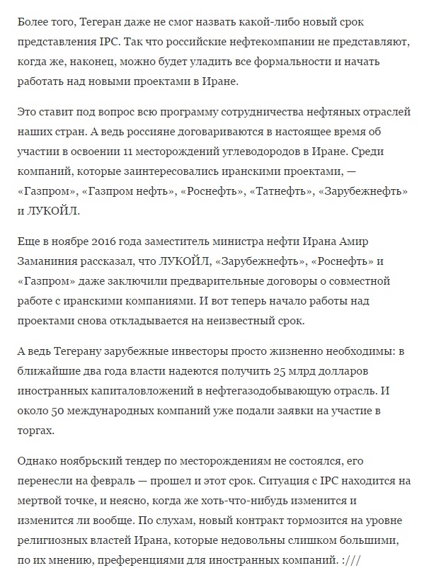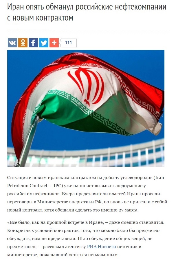 Российская сторона утверждает, что ранее были проведены переговоры между российским Минэнерго и представителями властей Ирана, однако Тегеран в очередной раз поставил Москву в ступор: ранее оговоренный новый контракт иранцы так и не привезли. Более того, они не хотят даже обсуждать на серьезном уровне детали возможной сделки и не намерены называть новый срок представления данного контракта, что, собственно, блокирует российским компаниям возможность работы над новыми проектами в Иране.
