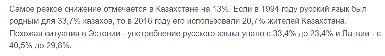 Россия продолжает сдавать позиции в очередной важной для "русского мира" сфере собственного влияния. Стало известно о том, что русский язык продолжает стремительно терять своих носителей, при этом за последние 25 лет он потерял больше, чем любой другой язык бывшего СССР. Распространение русского языка на территории СНГ уменьшилась во всех бывших республиках, за исключением Беларуси.