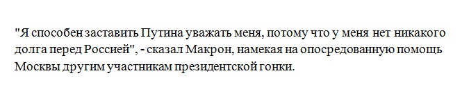 "Россия? Я ничего не должен Москве, а Путина быстро заставлю себя уважать", - будущий президент Франции Макрон сделал жесткое заявление в адрес Кремля