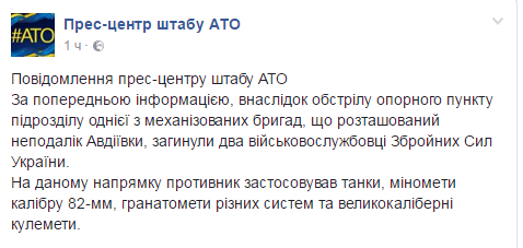 В Штабе АТО сообщают о двух погибших бойцах Вооруженных сил Украины, защищавших Родину неподалеку от Авдеевки. Боевики снова применили запрещенное международными соглашениями оружие.