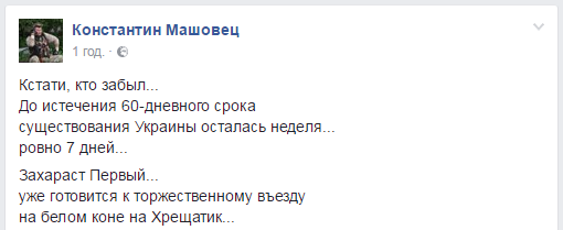 Он иронично отметил, что по истечении семи дней главарь боевиков готовится торжественно въехать на белом коне в столицу Украины.