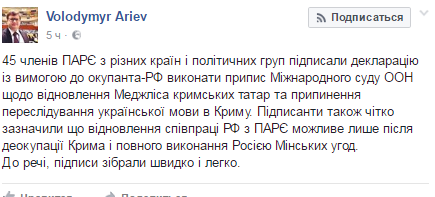 "45 членов ПАСЕ из различных стран и политических групп подписали декларацию с требованием к оккупанта-РФ выполнить предписание Международного суда ООН относительно возобновления Меджлиса крымских татар и прекращения преследования украинского языка в Крыму. Подписанты также четко отметили, что возобновление сотрудничества РФ с ПАСЕ возможно только после деоккупации Крыма и полного выполнения Россией Минских соглашений", - написал Арьев.
