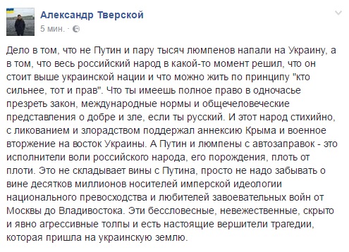 "Почему Россия решила, что она чем-то лучше Украины? Путин и люмпены с автозаправок – это и есть настоящие вершители трагедии, которая пришла на украинскую землю", - Тверской