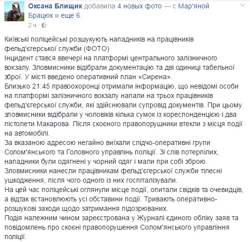 В Facebook спикер столичной полиции Оксана Блищик уточнила, что нападение произошло около 21:45, жертвами преступников стали 3 работников фельдъегерской службы.