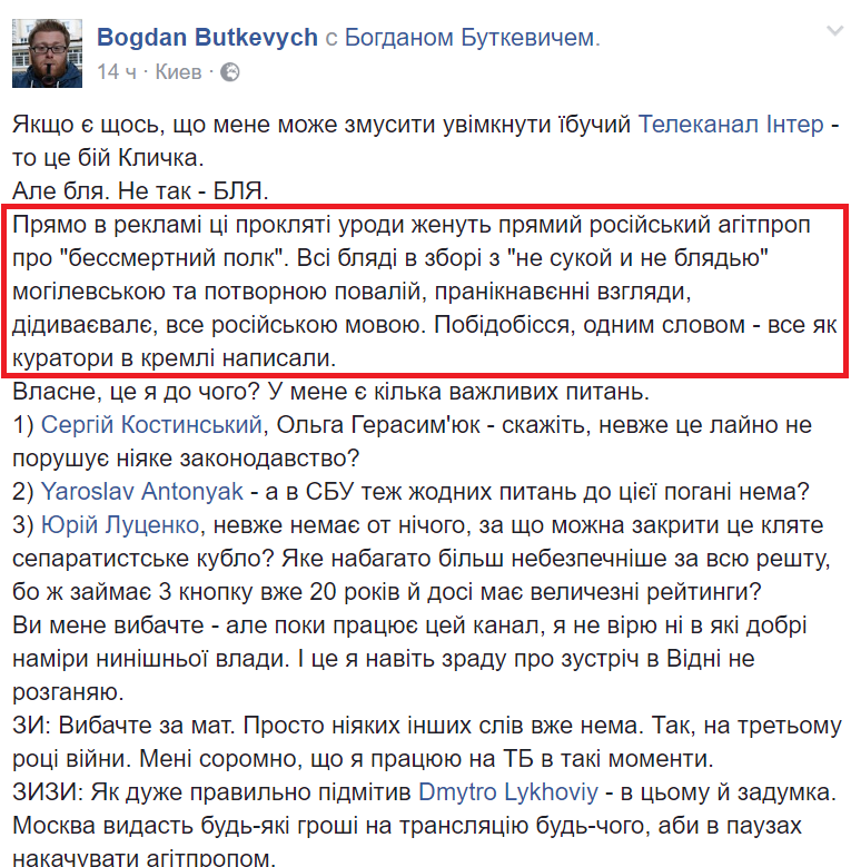 ​Телеканал "Интер" продолжает настраивать против себя украинское общество, транслируя пророссийскую пропаганду в прямом эфире. Очередной случай на собственной странице в соцсети описал журналист Богдан Буткевич.