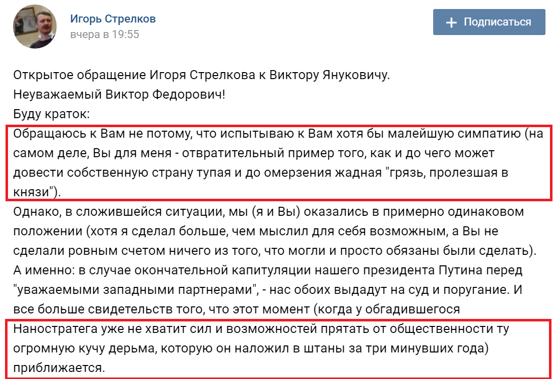 Стрелков назвал беглого экс-президента "тупой и до омерзения жадной грязью", которая захватила власть, а Путина назвал человеком, который за последние 3 года "наложил в штаны огромную кучу дерьма".