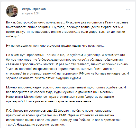 Он заявил, что Янукович вовсю собирается в Гаагу, где расположен Международный трибунал. Гиркин сообщил, что, несмотря на "убогость конченного дурака", он до сих пор обладает обширными связями среди российской политической элиты и власти.