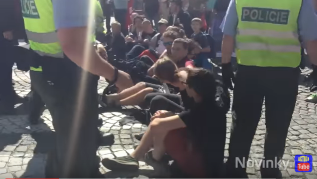 На Вацлавской площади активисты устроили настоящую демонстрацию, участники которой перекрыли проезжую часть сидячим пикетом. Позже сотрудники полиции освободила улицу для проезда российских байкеров.