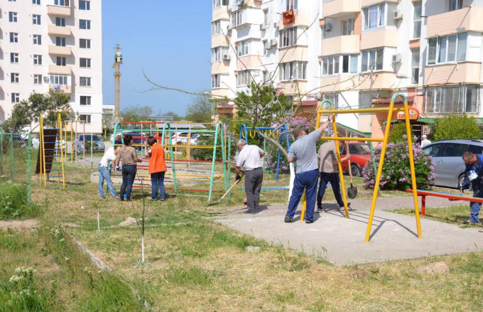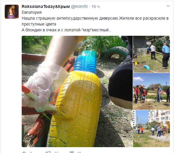 В аннексированной Евпатории жители одного из дворов оформили придомовую территорию в цветах украинского национального флага, причем на мероприятии по благоустройству присутствовал так называемый "мэр" города.