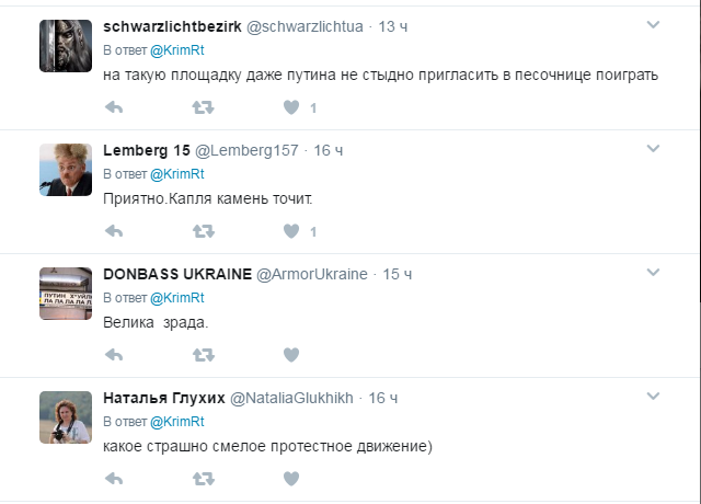 Подписчики страницы оценили "зраду" в Крыму и выказали свое отношение к особенностям благоустройства двора. Пользователь под ником Schwarzlichtbezirk написал, что на такую площадку даже Путина не стыдно пригласить в песочнице поиграть.