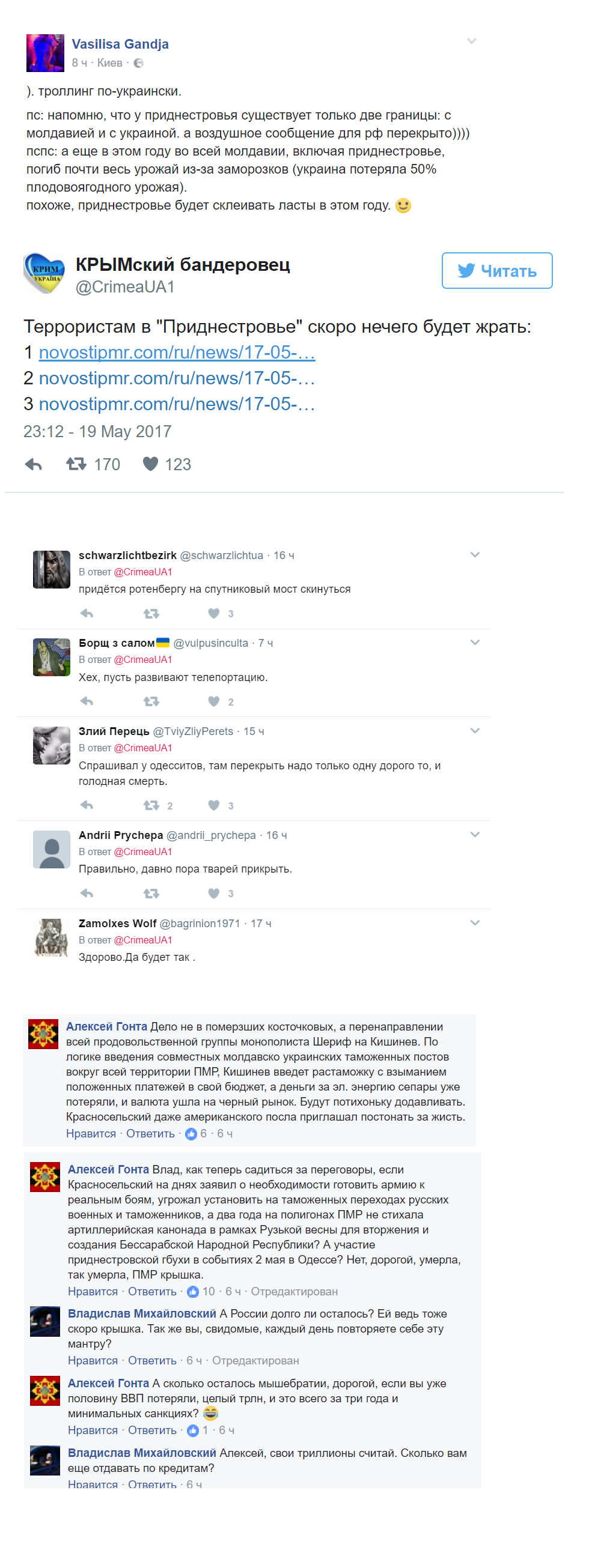 При этом в социальных сетях описали истинные масштабы проблемы, указывая, что у Приднестровья на данный момент есть лишь две границы - с Украиной и Молдовой, а воздушное сообщение для России Украина давно перекрыла. Проблема усугубляется гибелью практически всего урожая из-за заморозков, которые внезапно обрушились на регион поздней весной.