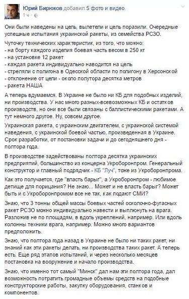 "Украинская ракета, с украинским двигателем, с украинской системой наведения, с украинской боевой частью, произведенная в Украине... Ее полтора года назад в Украине не было ни таких ракет, ни знаний как эти ракеты делать, ни производства таких ракет. А теперь есть", - сообщил Бирюков, отметив, что производство данных ракет и постановка их на вооружение ВСУ начнется уже через несколько месяцев.