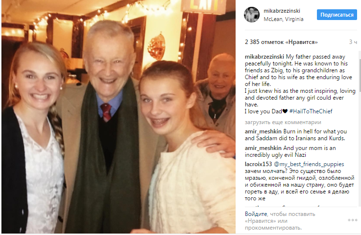 "Мой отец сегодня мирно скончался", - написала Мика Бжезински в комментарии под фото.