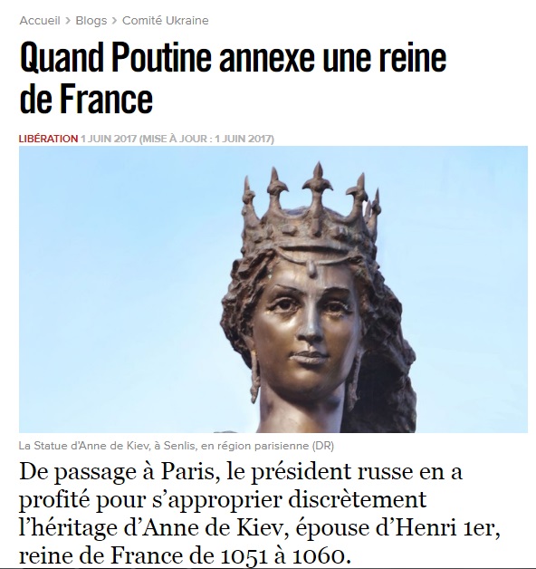 В подзаголовке сообщается, что во время своего визита во Францию президент России Владимир Путин использовал возможность, чтобы тихонько присвоить наследство Анны Киевской, жены французского короля Генриха I, которая была королевой Франции с 1051 по 1060 годы. Из уст российского президента вылетела фраза, которая просто возмутила украинцев. Путин, как отмечает французское издание, упорно дважды назвал Анну именно российской княжной - сначала на пресс-конференции в Версале 29 мая, а затем в интервью изданию Figaro 31 мая.