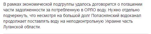 Со слов Олифер, экономической подгруппе в Минске удалось достичь определенного консенсуса с подконтрольными Москве сепаратистами. В частности договорились "о погашении части задолженности за потребленную в оккупированных районах воду".