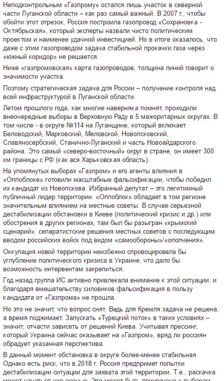 Депутат уточнил, что прошлым летом в Луганской области провели внеочередные выборы в Верховную Раду, где агенты российского газового монополиста и “Оппоблока” пытались провести фальсификации для победы их кандидата. В случае дестабилизации обстановки в Киеве или обострения в других регионах там был бы разыгран “крымский сценарий,” и “Газпром” захватил все объекты “Донбасстрансгаз”.